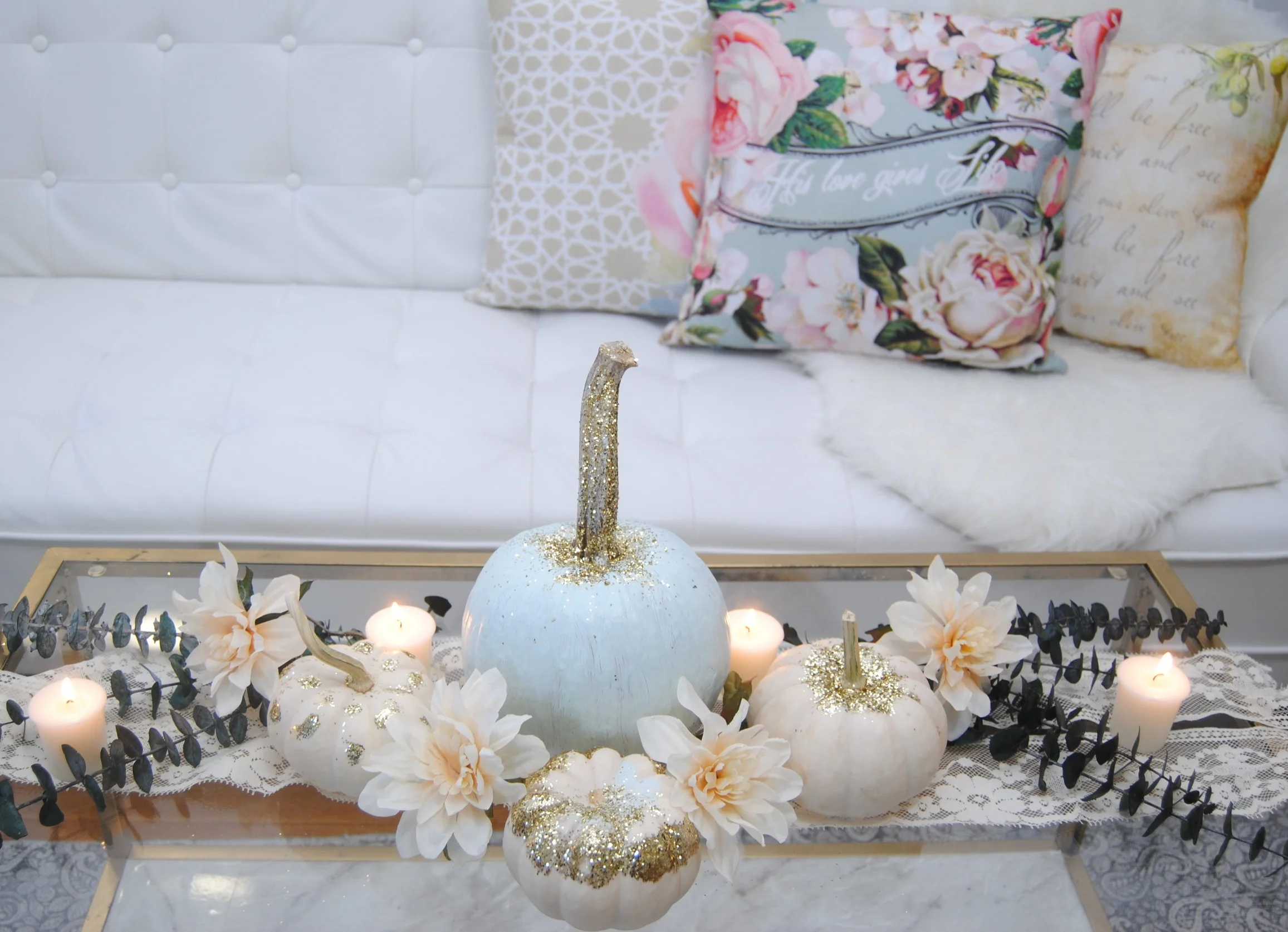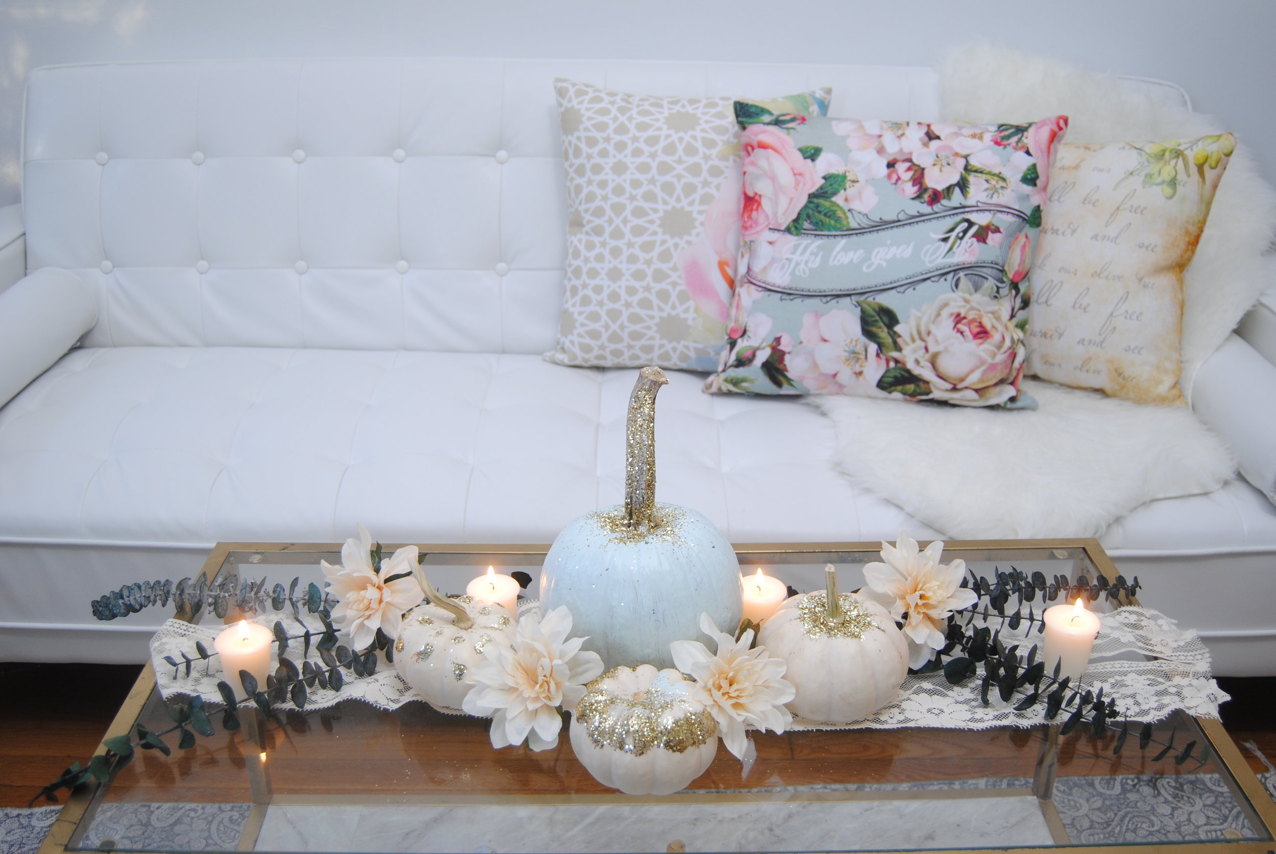 For the tablescape, I used lace, faux flowers, fresh eucalyptus and pumpkin scented candles :)