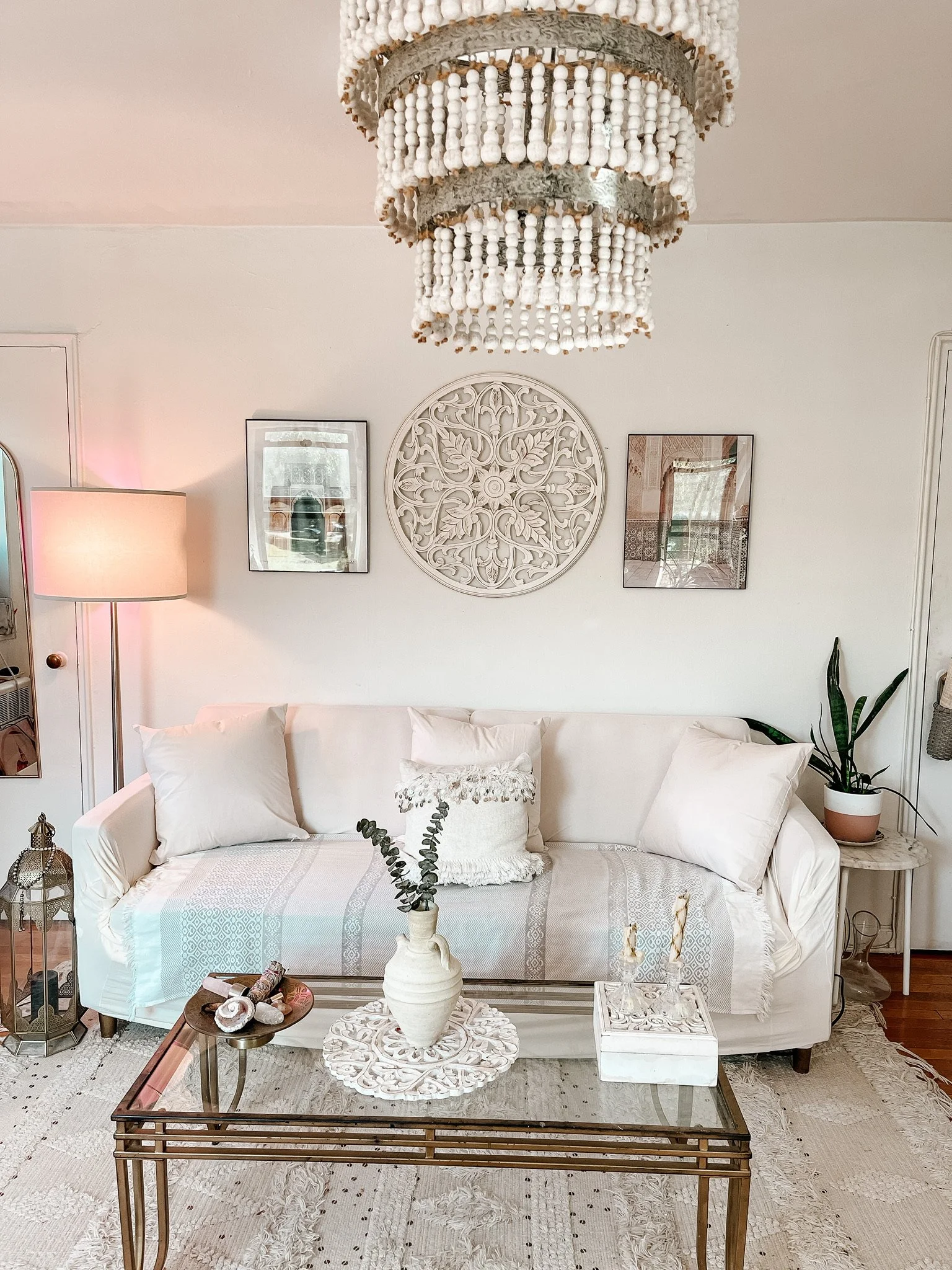 I decided to do a color change in my living room. I was tired of the pink, so I got white couch cover. The lampshades and pillow covers I got from an excellent company. GLAREDESIGN, they have this brilliant idea of changing the shades and covers to whatever you want.